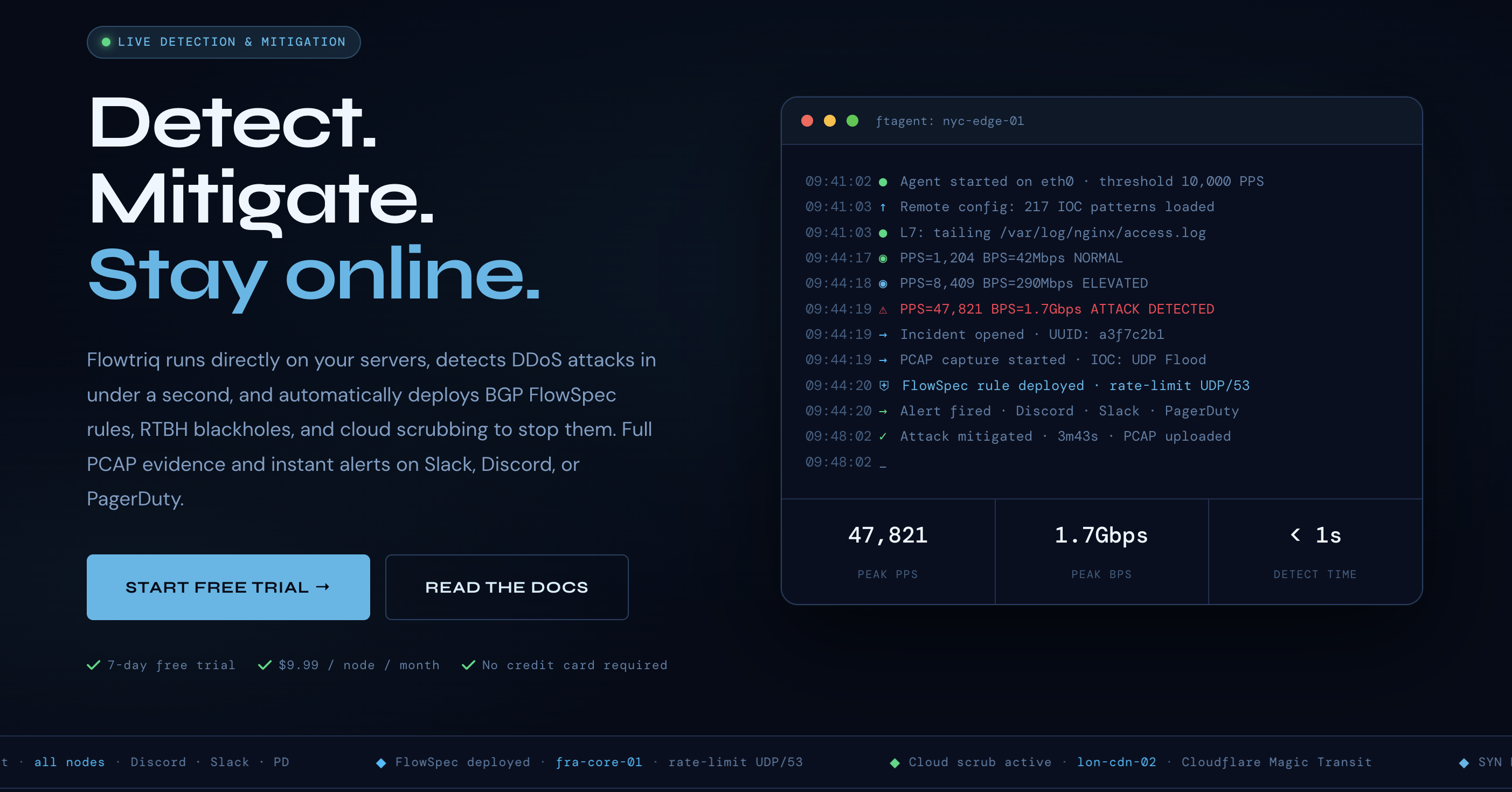 The ROI here is found in the radical reduction of Mean Time to Detect (MTTD) and Mean Time to Respond (MTTR). By automating the deployment of BGP FlowSpec rules and cloud scrubbing transitions, you eliminate the "human in the loop" delay that usually allows an attack to succeed. Furthermore, with a flat-rate pricing model of $9.99 per node, Flowtriq removes the "traffic tax" that often makes scaling security as expensive as scaling the product itself. It allows you to protect a massive, distributed architecture without the unpredictable surcharges associated with traditional legacy providers.